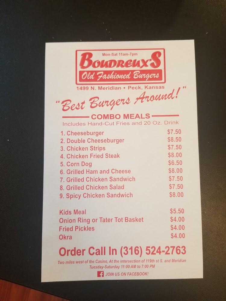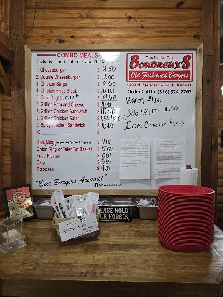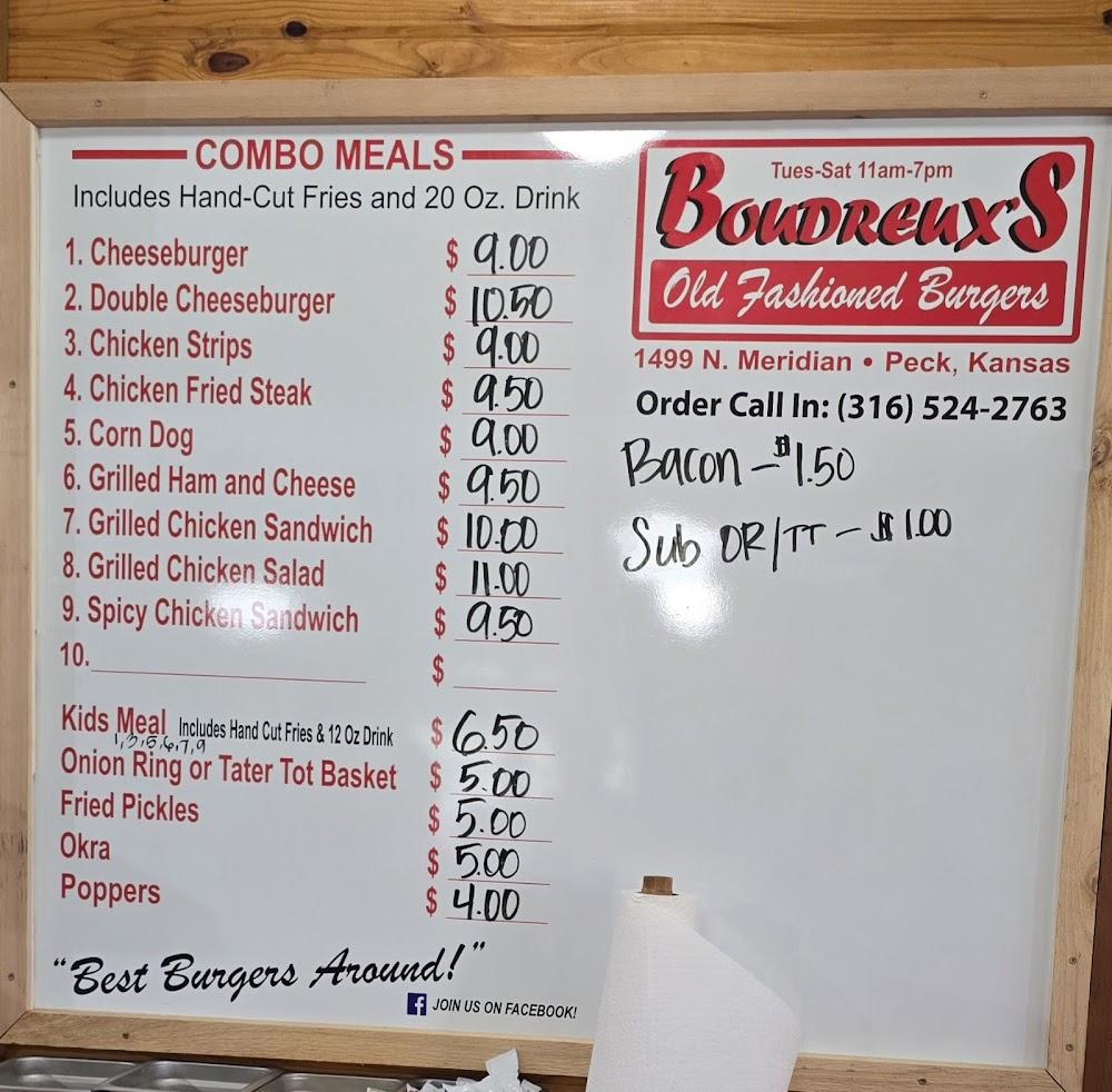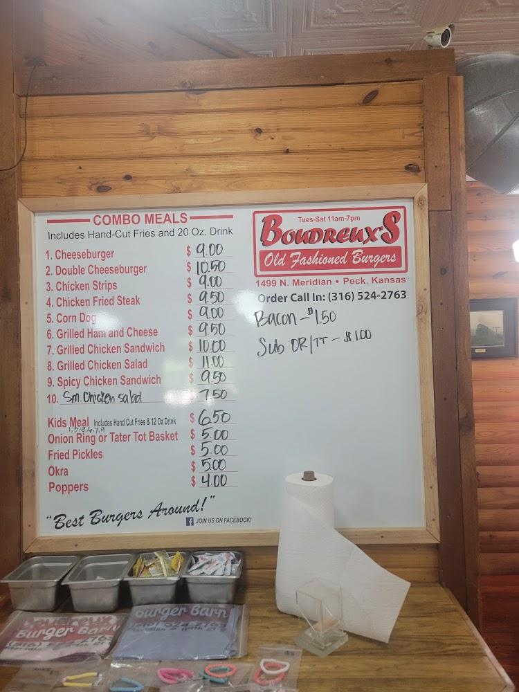 Welcome to Boudreux Burger Barn, your go-to spot for delicious, locally-inspired burgers in Peck, KS. Enjoy a relaxed atmosphere, whether dining in, taking out, or savoring food on our charming terrace. With a menu featuring simple, traditional meals and an array of desserts, we cater to everyone, including families and solo diners. Our restaurant offers accessible seating and facilities, plus convenient parking options. Join us for lunch or dinner and experience our quick service and welcoming environment. Please note, we will be closed on May 7th and 8th. Call us at +1 316-524-2763 for reservations or inquiries!